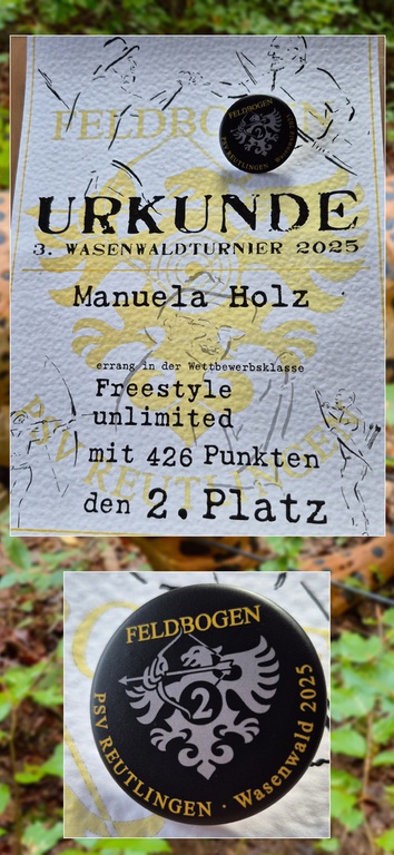 Am 28.09.2025 ging es dann nach Reutlingen zum Wasenwaldturnier. Morgens um 5 Uhr hat uns der Wecker das Zeichen gegeben, heute ist Turniertag. Mit einem guten Frühstück ging es dann bei Zeiten los, um rechtzeitig vor Ort zu sein, um einen guten Platz zu ergattern. Wir hatten wieder das große Glück mit einer super Truppe den Parcour zu bezwingen. In unserer Gruppe hatten wir auch ein Sahneschnittchen dabei, den amtierenden Deutschen BHL Meister , der extra aus dem Sauerland angereist war. Er ist mit seinem Compoundbogen wirklich ein Ass , und hat natürlich in seiner Bogenklasse den ersten Platz geholt hat. In meiner Klasse FU Damen konnte ich mir eine Urkunde abholen, ich habe das zweiten Treppchen ergattert, mit 426 Punkten, und war richtig stolz drauf. Klaus hatte in seiner BU Klasse eine Vielzahl von Mitkämpfern, und hat mit 455 Punkten den 9.ten Platz geschafft. Beim Turnier gab es eine bunte Mischung an Zielen, welche sehr nah, aber auch relativ sehr weit weg standen. Der XXL-Weitschuss auf den Grizzly war ca. 70 Meter entfernt. Außerdem hat uns der PSV Reutlingen 4 Bowhunter Doppelschüsse auf zwei verschieden Tiere als Aufgabe gestellt. Sprich, die ganze Bandbreit des 3D Bogenschießens war hier präsentiert. Ein toller Tag.