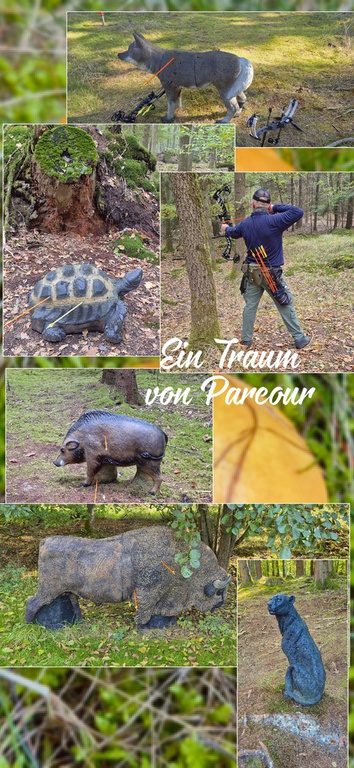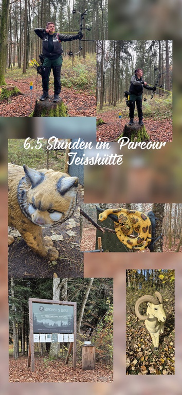 Gestern ging es dann gegen 8 Uhr los in Richtung Blumberg. Pünktlich um 9.30 Uhr haben wir uns dann am Einschussplatz aufgewärmt. Je nach Lust und Laune kann man sich für 3 Tourenentscheiden. Eine kurz Tour mit 2,5 km, eine mittlere Tour mit ca. 4,5 km und eine lange Tour mit ca. 6,5 km und insgesamt 44 Stationen. Die Jeisshütte liegt wunderschön im Hochwald vom romantischen Kennental. Hier hat man einen Weitblick in den Schwarzwald, und wir konnten sogar den Feldberg sehen. Das Wetter konnte nicht besser sein. Wir haben uns dann für die lange Tour entschieden, und alle 44 Ziele ins Visier genommen. Hier gibt es alles was man sich wünscht. Ein Traum für Bogenschützen. Da ist für jeden was dabei. Ob kurz oder lang, ob hoch oder tief… es sind klasse Ziele. Bären, Hirsche, Wapiti, Raubkatzen, Tigerphyton, Kleintiere, Vögel uvw. sind im Wald und in die Natur integriert. Die Tiere sind liebevoll gestellt. Es gibt Jagdszenen, da bleibt einem vor Stauen echt die Spucke weg. Der Spaß darf natürlich auch nicht fehlen. Vom Hochstand, einer Wippe, einem Pferd und einem Pendel war alles dabei. Dann gab es zwei Schießbuden. Hier musste man Frösche treffen, die nach hinten klappten, wenn der Pfeil sein Ziel getroffen hat, oder eine Mini-Eule, die saß auf 5 Rollen WC-Papier. Einfach klasse. Nach knapp 7 Stunden war dann die Puste voll und ganz weg, die Beine taten weh, der Bogenarm hat schlapp gemacht, und wir wollte nur noch eins…. Schuhe runter und was kaltes trinken. Das letztere war erst zu Hause möglich. Ein richtig toller Tag im Parcour Jeisshütte. Nur zu empfehlen.