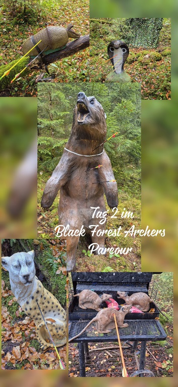Dann ging es im Oktober in den schönen Schwarzwald nach St. Roman zum Wellness-Urlaub. Wer jetzt glaubt, dass wir nur erholsame Körperpflege im Sinn hatten, liegt falsch. Im Kofferraum hatten nur kleine Koffer Platz, der größte Teil hat die Bogenausrüstung benötigt. Leider hatte der Bogengott kein gutes Wetter für uns in Aussicht. Es hat geregnet. Da der Parcour von Alex Kübler nur 5 Minuten entfernt war, haben wir die Wetter-App unserer Handys genutzt, um eine regenfreie Zone zu nutzen, um unsere Bögen aus der Tasche zu holen. Der erst vor 4 Wochen davor eröffnete Parcour war knifflig. Die Wegführung und auch die Laufwege waren nicht einfach. Am zweiten Tag unserer Bogentour war der Regen unser ständiger Begleiter. Da wir aber gut vorbereitet waren, habe ich mir den Einweg-Plastik-Sack oder Poncho übergezogen. Der Vorteil war lediglich dass ich trocken geblieben bin. Kaum war das Ding an, hat es auch schon wieder aufgehört zu regnen, aber das Gelände war natürlich sehr rutschig. Die große Tour war ca. 7.5 Kilometer lang. Ein Weitschuss von 90 Meter war der Knaller. Das Bison hat es nicht überlebt, und wurde von Klaus und mir erlegt. Meine Motivation war jedoch am Ende, als es mir an einer sehr sumpfigen Stelle, wo meine 3 Pfeile lagen, beim Laufen den Schuh ausgezogen hat. Plums, da lag ich dann komplett der Länge nach im Sumpf. Klaus hat darauf nur einen Lachanfall bekommen. Ich sah aus wie ein Sniper im Tarnmodus, der Dreck war überall. Schuld war eine am Baum hängende Würgeschlange. Mein Frust war unendlich. Klaus hat den Parcour im Gegensatz zu mir erfolgreich abgeschlossen, und den Sieg ergattert. Glückwunsch an meinen Robin Hood.